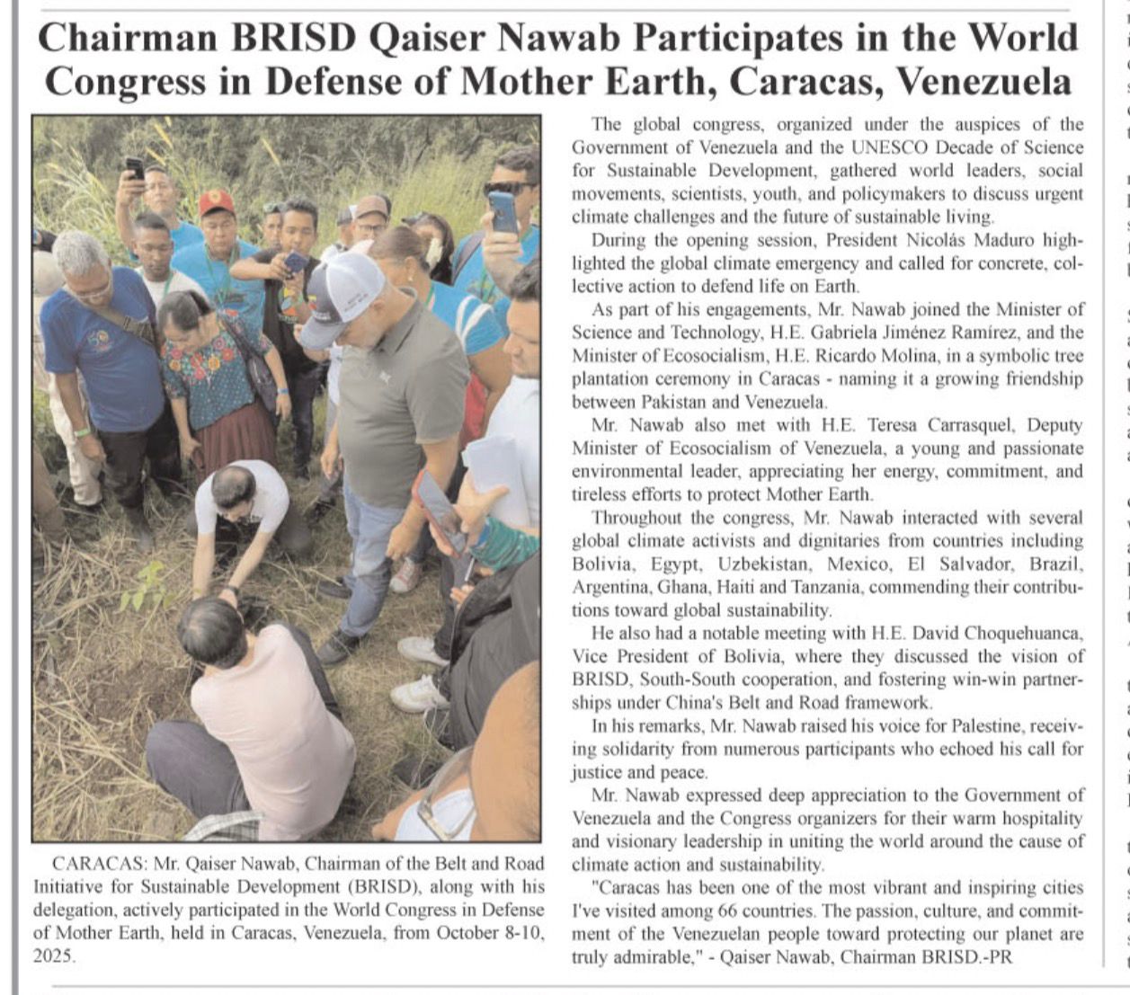 Caracas, Venezuela – Mr. Qaiser Nawab, Chairman of the Belt and Road Initiative for Sustainable Development (BRISD), actively participated in the World Congress in Defense of Mother Earth, held in Caracas, Venezuela, from October 8–10, 2025, along with his delegation.